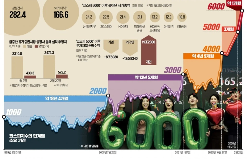 코스피지수가 최단기간 5000에서 6000을 돌파한 건 반도체가 이끄는 상장사의 '이익 체력' 회복과 정부의 자본시장 체질 개선 정책이 맞아떨어졌기 때문이다. 5000 벽을 뚫은 뒤 단기 조정이 있을 수 있다는 우려를 뒤로한 채 숨 가쁜 랠리가 이어지자 개인투자자들은 뒤늦게 상장지수펀드(ETF)를 통해 19조원 넘는 K주식을 쓸어 담고 있다. 증시 대기자금 성격인 투자자 예탁금이 100조원에 달하는 만큼 '제2 동학개미운동'이 본격화하고 있다는 평가가 나온다.