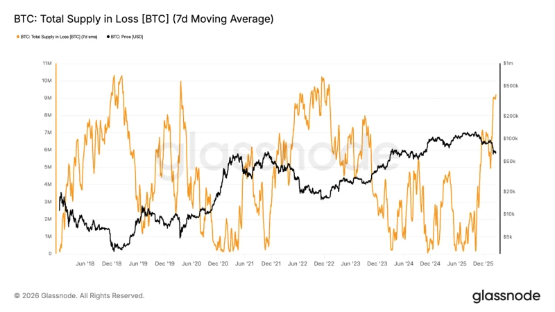 글래스노드는 "현재 약 920만개의 비트코인이 손실 상태"라고 강조했다. 글래스노드는 "'총 손실 공급량(Total Supply in Loss)'은 매입 단가가 현재 현물 가격을 초과하는 비트코인 수량을 측정해 미실현 손실이 얼마나 광범위하게 발생했는지 보여주는 지표"라며 "해당 지표의 7일 이동평균은 약 920만개까지 상승해 유통량의 거의 절반이 손실 상태에 있다는 점을 보여준다"고 했다. 이어 "이처럼 높은 수준의 매도 물량은 역사적으로 약세장 후기에 나타나는 특징"이라며 "시장 변동성과 취약성이 지속되고 있지만 초기 하락 국면보다는 잠재적인 바닥을 형성하는 영역에 가까워 보인다"고 덧붙였다.