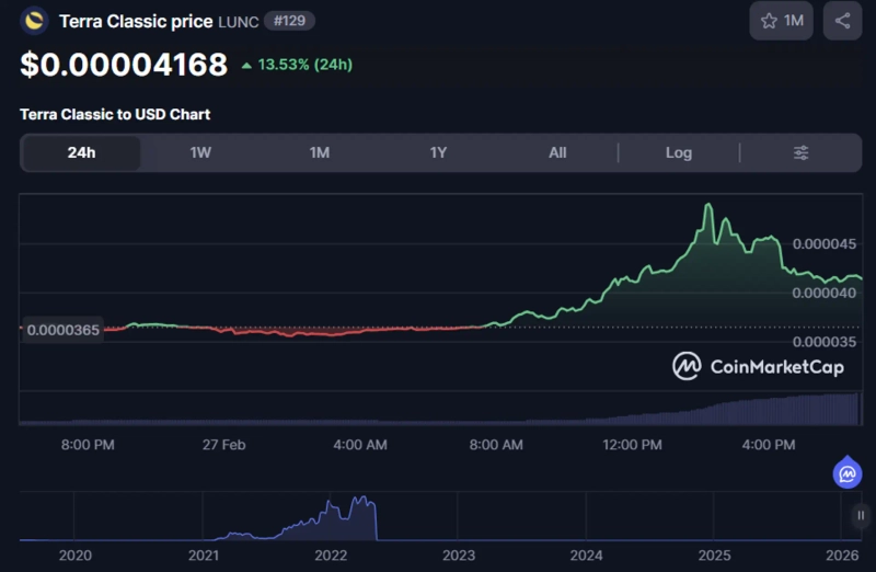 27일(한국시간) 오후 6시 40분 현재 테라 클래식은 코인마켓캡 기준 전일대비 13.53% 급등한 0.00004168달러를 기록 중이다.