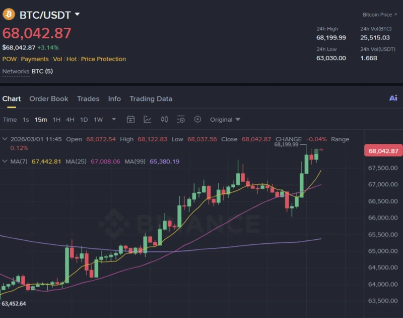 1일(한국시간) 오전 11시 40분 현재 비트코인은 바이낸스에선 전일대비 3.14% 상승한 6만8042달러에 거래되고 있다. 비트코인은 전날 미국과 이스라엘이 이란을 공습한 직후 6만3000달러까지 급락했으나, 이날 상승세로 전날의 하락분을 모두 회복했다.