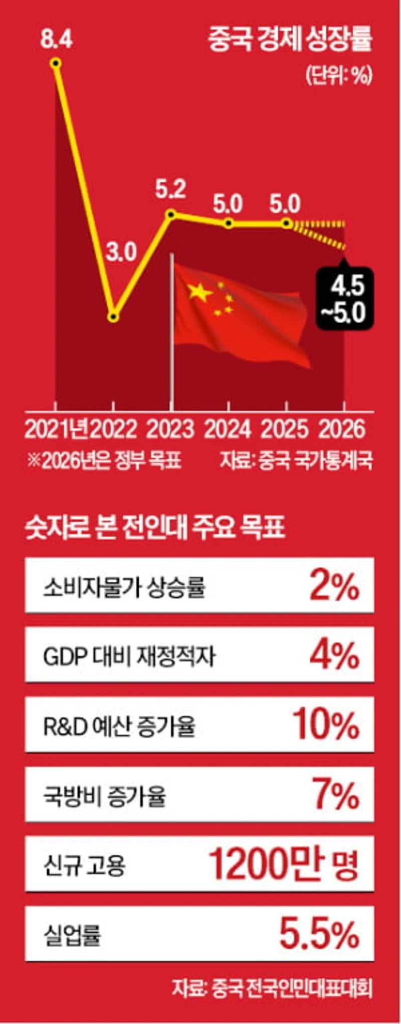 올해 성장률 목표치를 하향 조정한 건 과거 중국의 고속 성장을 이끌던 부동산 경기 둔화가 지속하고 내수 부진이 이어지는 상황에서 미국의 관세 압박, 이란 공습 등 대외 불확실성을 고려한 결정으로 해석된다. '5% 안팎' 목표치를 달성하기 위해 무리한 경기 부양책을 추진하기보다 현실적 목표치를 설정해 산업 구조조정과 내수 부양 등 내실을 택하려는 취지다.