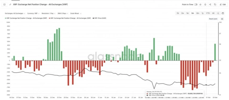상대적으로 제한적인 흐름을 보이는 이유는 온체인 데이터에서 매도 압력 확대 흐름이 포착되고 있기 때문입니다. 글래스노드에 따르면 엑스알피의 거래소 순 포지션 변화 지표는 약 2주 동안 자금 유출을 보이다가 최근 플러스로 전환됐습니다. 일반적으로 거래소 유입 증가는 매도 준비 신호로 해석됩니다.