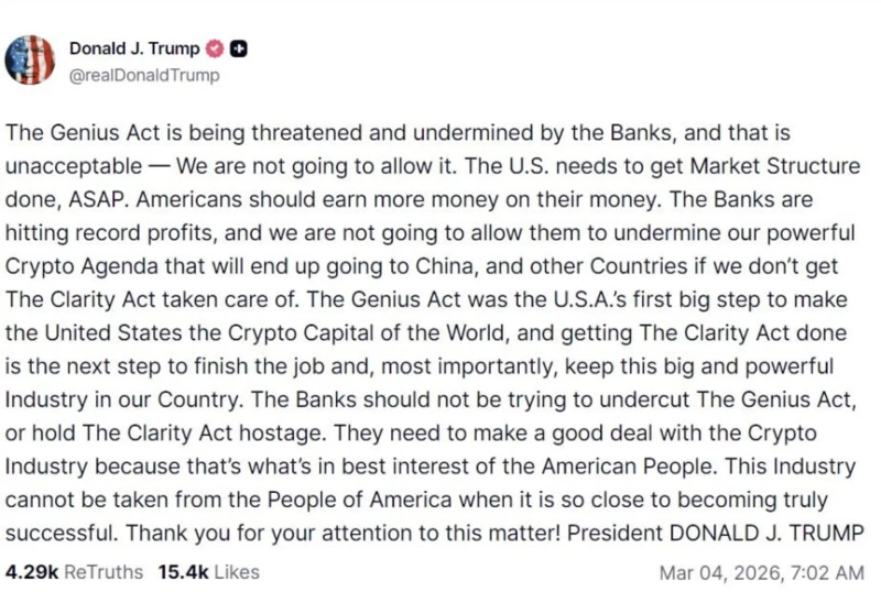 상승의 한 축에는 도널드 트럼프 미국 대통령의 규제 관련 발언이 자리했습니다. 트럼프 대통령은 지난 4일(현지시간) 자신이 만든 소셜미디어 트루스소셜을 통해 스테이블코인 규제 문제를 언급하며 "은행권이 가상자산 시장구조 법안(CLARITY Act.)을 사실상 인질로 잡고 있다"고 비판했습니다. 그는 "은행들은 가상자산 업계와 합의를 해야 하며, 의회는 해당 법안을 신속히 통과시켜야 한다"고 강조했습니다.