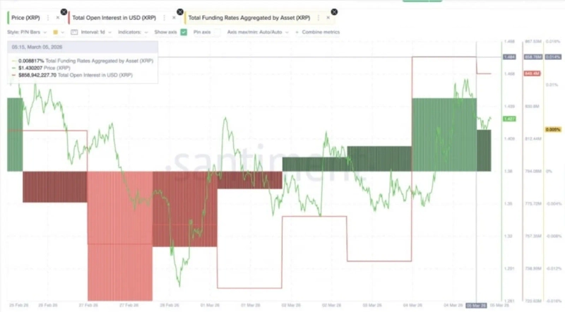 다만 파생상품 시장에서는 다른 신호도 관찰됩니다. 엑스알피 선물 미결제약정은 3월 2일부터 5일까지 약 18% 증가했고, 펀딩 금리도 마이너스에서 플러스 영역으로 전환되며 롱 포지션이 늘어난 모습이 나타났습니다.
