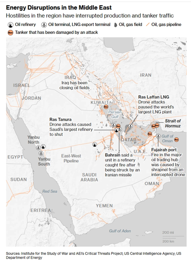 미국·이스라엘과 이란 간 전쟁으로 이란이 호르무즈 해협 운항을 차단하고 나서면서 걸프 지역 국가들이 잇달아 생산량을 줄이기 시작했다. 생산을 해도 수출길이 막힌 상황에서 원유를 쌓아놓는 데는 한계가 있기 때문이다. 이는 급등하고 있는 국제 유가를 한층 더 끌어올릴 것으로 예상된다. 감산이 지속될 경우 생산을 재개하는 데도 오랜 시간이 소요될 전망이어서, 시일이 길어질수록 세계 경제의 성장률을 끌어내리는 요인이 될 전망이다.