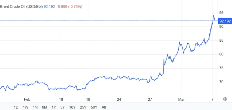 유가는 폭등을 거듭하고 있다. 사드 알카비 카타르 에너지장관은 지난 6일 전쟁이 빨리 끝나지 않으면 2~3주 내로 원유 가격이 배럴당 150달러까지 치솟을 것이라고 말했다. 골드만삭스는 호르무즈 해협 통행을 재개하기 위한 해결책의 실마리가 나오지 않으면 이번 주 중 유가가 100달러를 넘어설 것이라고 6일 전망했다. 골드만삭스는 또 "정유 제품의 가격은 2008년 최고치(브렌트유 배럴당 140달러)를 넘어설 가능성이 높다"고 덧붙였다.