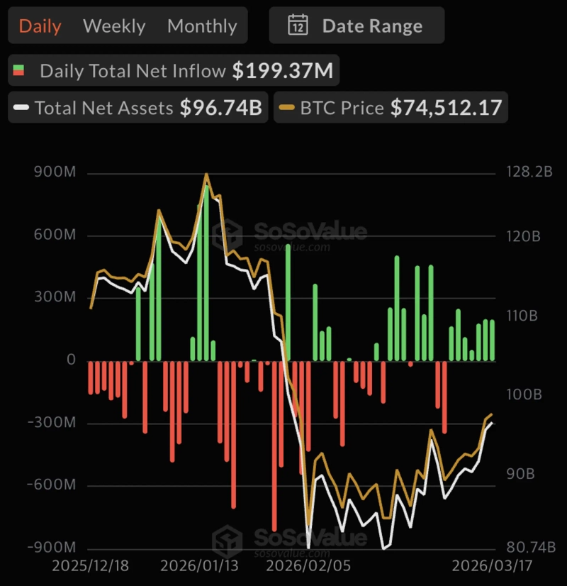 17일(현지시간) 소소밸류에 따르면 이날 기준 비트코인 현물 ETF에 최근 7거래일 연속 자금이 순유입됐다. 지난해 10월 이후 일간 기준 최장기 순유입 행진이다.