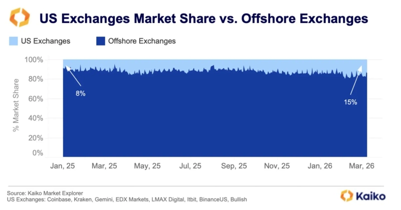 실제로 미국 가상자산 시장의 점유율 확대 흐름도 나타나고 있다. 가상자산 분석업체 카이코는 "미국 거래소의 현물 시장 점유율이 지난 1년 만에 8%에서 15%로 확대됐다"며 "미국 내 비트코인 유동성도 외국 거래소 대비 더 깊고 빠르게 성장하고 있다"고 분석했다.