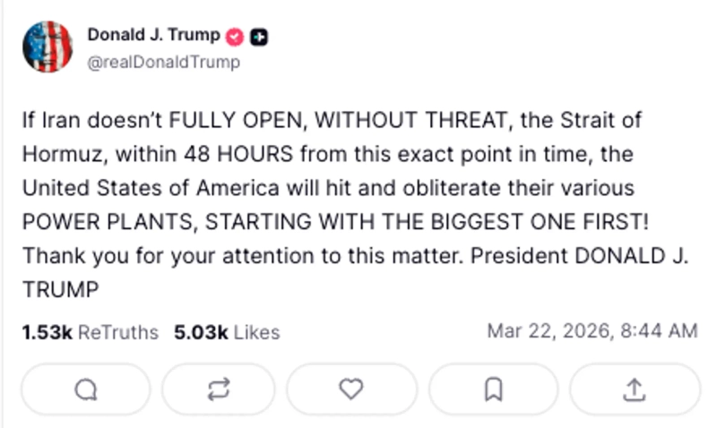 트럼프 대통령은 이날 트루스소셜을 통해 "이란이 지금 시점부터 48시간 내에 위협 없이 호르무즈 해협을 완전히 개방하지 않을 경우, 미국은 이란의 다양한 발전소를 타격하고 파괴할 것"이라고 밝혔다. 그는 이어 "가장 큰 발전소부터 공격을 시작할 것"이라고 덧붙였다.