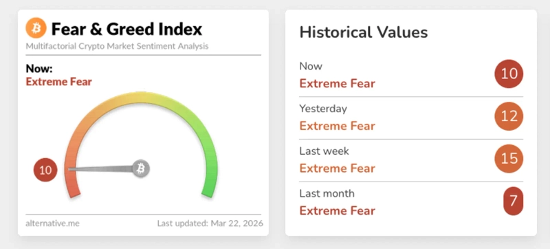 22일 가상자산 전문 미디어 블록비츠에 따르면 데이터 제공업체 얼터너티브(Alternative)의 공포·탐욕 지수는 이날 10을 기록했다. 전일(12) 대비 추가 하락하며 '극단적 공포(Extreme Fear)' 구간이 심화된 모습이다.