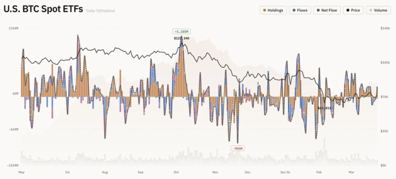 반면 일부 ETF에서는 자금 유출이 나타났다. 아크인베스트 ARKB는 941만달러 순유출을 기록했고, 그레이스케일 GBTC에서도 2587만달러가 빠져나갔다. 나머지 상품은 순유출입이 없었다.