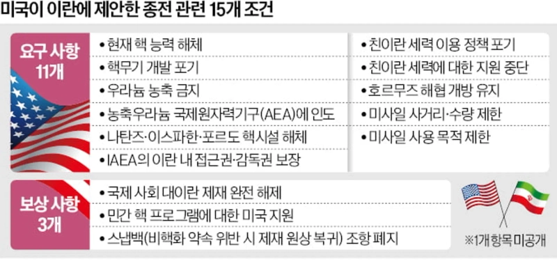 미국은 이란에 15개 조항으로 구성된 요구안을 전달한 것으로 알려졌다. 뉴욕타임스(NYT)는 이란과 국경을 맞대고 있는 파키스탄이 전달자 역할을 맡았다고 전했다. 이란이 보유한 우라늄을 즉시 해외로 반출하고 모든 농축 시설은 한 달 내 가동을 중지하는 내용 등이 담겼다. 원심분리기를 무력화하고 이란 외 지역에 핵연료 저장 시설을 건설해 유엔 사찰을 받게 하는 등 향후 핵 개발 가능성도 제거하겠다는 것이 목표다. 이란으로선 수락하기 쉽지 않은 내용이다.