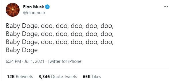 1일(현지시간) 일론 머스크 테슬라 최고경영자(CEO)가 유명 동요 아기상어(Baby shark)의 가사를 바꿔 베이비 도지(Baby Doge)를 반복적으로 읊은 내용의 트윗을 올렸다.
