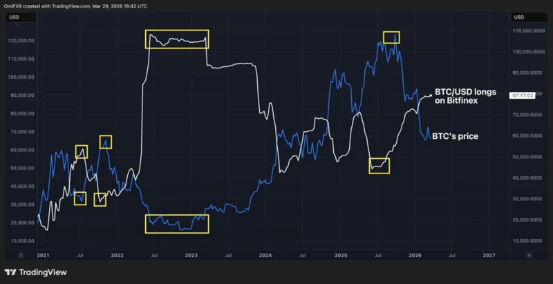 - 비트파이넥스 내 비트코인(BTC) 롱 포지션 규모가 약 7만9343 BTC까지 증가해 2023년 11월 이후 최고치를 기록했다고 밝혔다.