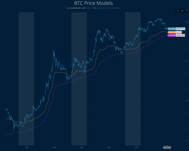 29일(현지시간) 가상자산(암호화폐) 분석가 윌리 우는 온체인 모델 기준 비트코인의 바닥 범위를 약 4만6000달러에서 5만4000달러로 제시했다. 특히 CVDD 플로어 모델은 약 4만5500달러 수준에서 형성되며 점진적으로 상승하는 흐름을 보이고 있다고 설명했다.