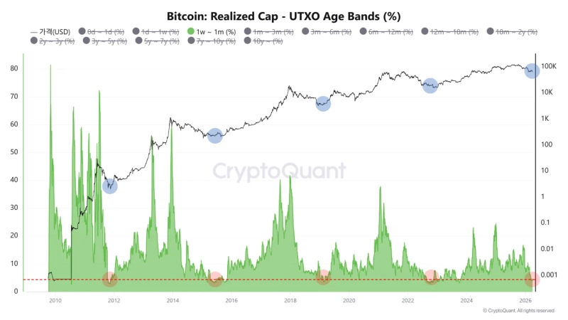맥디(MAC D) 크립토퀀트 기고자는 31일(현지시간) 크립토퀀트를 통해 "비트코인을 1주에서 1개월간 보유한 단기투자자 비중이 현재 3.98%까지 하락했다"며 "과거 사이클에선 해당 비중이 4% 이하로 내려갈 때 시장 바닥 구간과 맞물리는 경우가 많았다"고 밝혔다. 맥디는 "사이클이 진행될수록 장기투자자 비중은 자연스럽게 증가하는 경향이 있다"며 "현재 수치는 시장이 바닥에 근접하고 있다는 의미 있는 신호로 해석할 수 있다"고 했다.