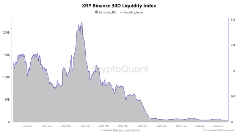 따라서 단순 계절성보다는 실제 시장 환경이 중요할 것으로 보이는데요. 현재 온체인 지표는 오히려 신중한 접근을 요구하고 있습니다. 크립토퀀트 기고자 아랍체인에 따르면 엑스알피의 30일 유동성 지수는 약 0.062 수준까지 하락하며 최근 최저 수준 중 하나를 기록했습니다. 이는 시장 깊이가 얕아졌으며, 적은 거래에도 가격 변동성이 확대될 수 있는 환경임을 의미합니다. 동시에 30일 거래량도 약 44억6000만달러 수준으로 감소해 시장 참여 자체가 위축된 모습입니다.