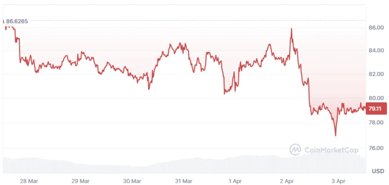 최근 솔라나는 낙폭이 확대되며 투자심리가 위축된 흐름을 보였습니다. 지난 일주일 새 코인마켓캡 기준 9% 이상 하락하면서 상위 알트코인 중 눈에 띄는 낙폭을 보였는데요. 3일 현재 79달러선에서 거래되고 있습니다.