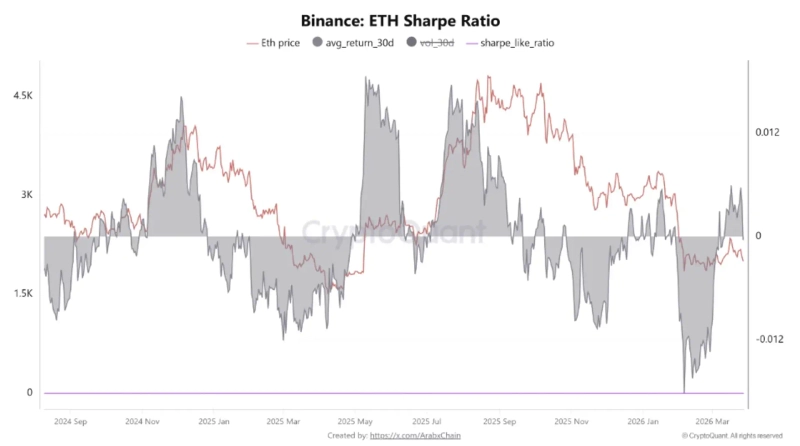 이 때문에 가격은 유지되고 있지만 수익성과 시장 효율성이 낮아졌다는 분석이 나옵니다. 크립토퀀트 기고자 아랍체인 분석에 따르면 바이낸스 기준 이더리움의 30일 평균 수익률은 -0.00039, 샤프지수는 -0.0012 수준으로 나타났습니다. 샤프지수는 위험 대비 수익 효율을 나타내는 지표로, 0 이하일 경우 투자 효율이 낮다는 의미입니다. 현재 이더리움은 리스크 대비 충분한 수익을 제공하지 못하는 구조에 놓여 있는 셈입니다. 아랍체인은 "이는 가격이 안정적으로 보이더라도 시장의 질적인 측면에서는 아직 회복되지 않았다는 의미로 해석된다"고 진단했습니다.