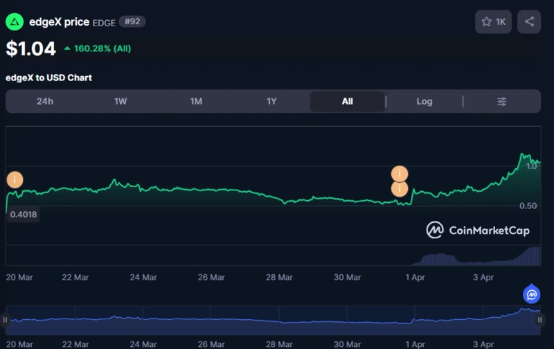 4일(한국시간) 가상자산(암호화폐) 시황 제공 웹사이트 코인마켓캡에 따르면 엣지엑스는 전일대비 26.8% 급등한 1.04달러에 거래되고 있다.