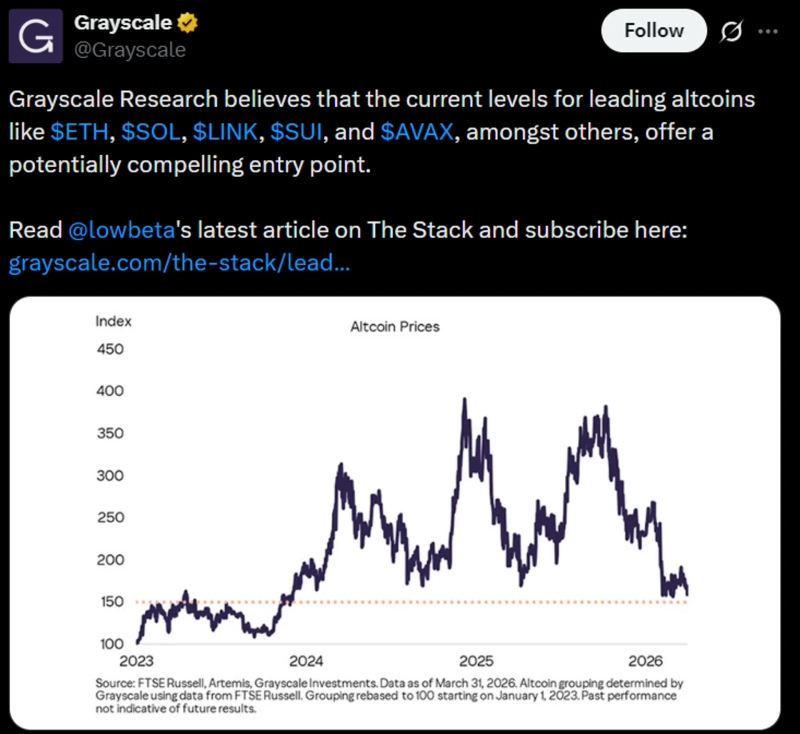 - 그레이스케일은 주요 알트코인이 역사적 저점 수준에 근접해 매수 기회라고 분석했다고 밝혔다.