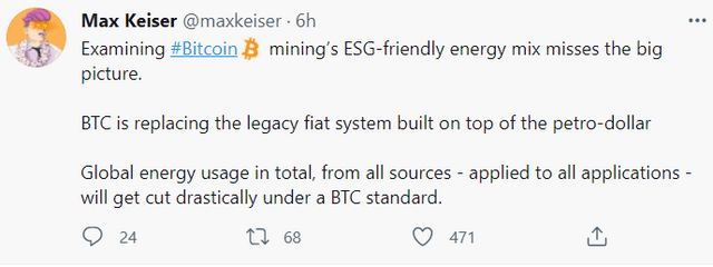 전직 월가 트레이더인 유명 비트코인 맥시멀리스트 맥스 카이저(Max Keizer)가 자신의 트위터를 통해 "비트코인 채굴에 EGS(환경·사회책임·지배구조) 친화적 에너지를 결합하는 실험은 큰 그림을 놓치는 것"이라고 했다. 그는 "비트코인은 오일달러를 기반으로 구축된 법정화폐 시스템을 대체하고 있다"며 "글로벌 에너지 이용 총량은 비트코인 스탠더드 아래로 크게 줄어들 것"이라고 말했다.