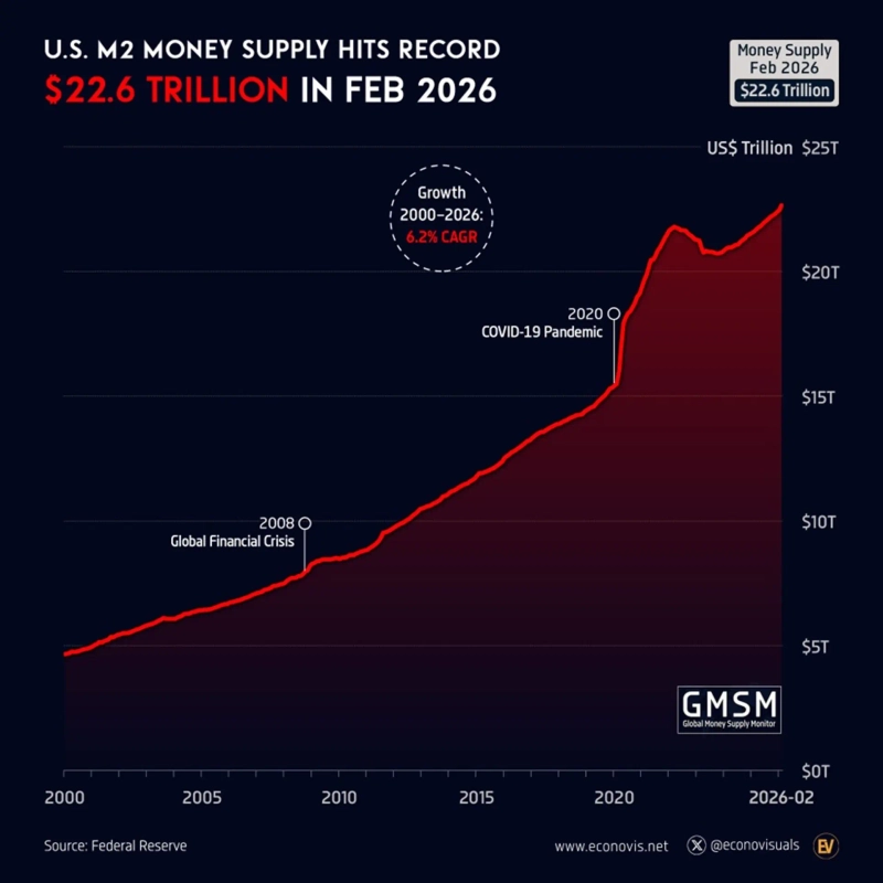 - 미국의 M2 통화량이 22조6000억달러로 사상 최대치를 기록하며 달러 가치 하락 우려를 키우고 있다고 밝혔다.