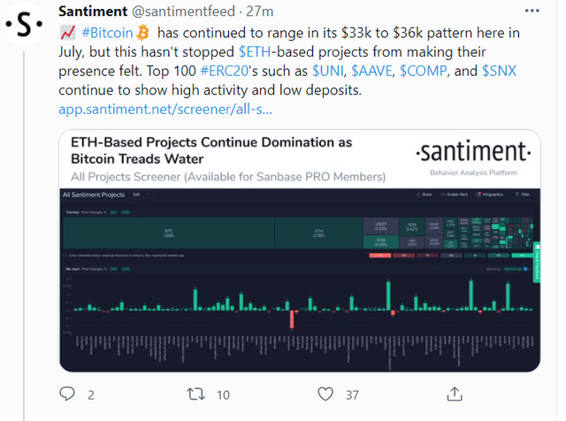6일 가상자산(암호화폐) 데이터 분석업체인 센티멘트(Santiment)는 트위터를 통해 "7월 비트코인 3만3000~3만6000달러 구간 사이를 횡보하고 있다"며 "하지만 이더리움 기반 프로젝트는 긍정적인 흐름을 보이고 있다. 유니스왑(UNI), 에이브(AAVE), 컴파운드(COMP), 신세틱스(SNX) 등 상위 100개 ERC-20 토큰은 활동량에 있어 계속해서 강세를 띠고 있다"고 했다.