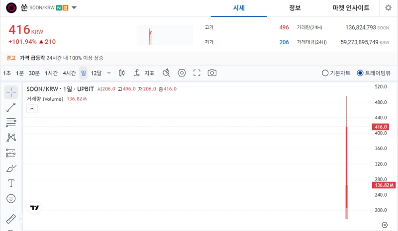 업비트에 신규 상장된 쑨(SOON)이 장중 급등하고 있다.