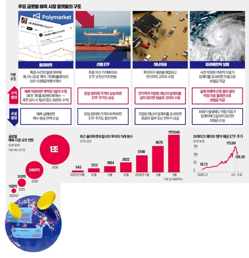 미래를 예상하는 예측 산업이 글로벌 금융시장에서 입지를 넓히고 있다. 미국·이란 전쟁 종전부터 올여름 동남아시아 태풍 피해, 각국의 주요 선거 결과까지 예측해 투자하는 산업이다. 매 순간 '군중의 예상'이 수치로 나타나 월가에선 해당 지표가 핵심 투자 인프라로 떠올랐다. 세계 곳곳에서 커지는 지정학 리스크가 관련 시장을 견인하며 2030년에 1조달러(약 1474조원) 규모로 확대될 것이라는 전망이 나온다.