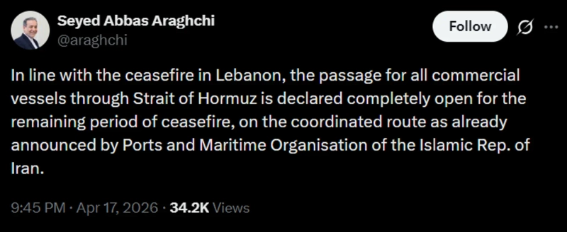 17일(한국시간) 아라그치 외무장관은 엑스(구 트위터)를 통해 "레바논 휴전에 발맞춰 남은 휴전 기간 동안 모든 상업용 선박의 호르무즈 해협 통과를 전면 개방한다"며 "이란 항만청(PMO)이 기존에 공지한 협조 항로를 따라 운항이 이뤄질 것"이라고 말했다.