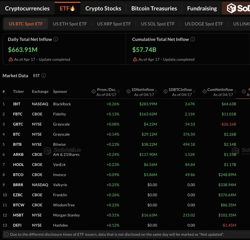 17일(현지시간) 소소밸류의 데이터에 따르면 이날 미국 비트코인 현물 ETF 13종에 총 6억6391만달러의 자금이 순유입됐다. 지난 14일부터 4거래일 연속 순유입 기조를 유지했다. 전일(2605만달러)과 비교해 유입 규모가 큰 폭으로 늘었다.