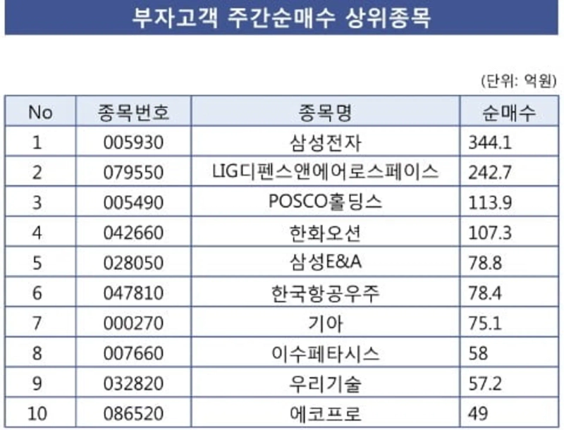 - 평균 잔액 10억원 이상 자산가는 삼성전자, LIG디펜스앤에어로스페이스, POSCO홀딩스를 대규모로 순매수했다고 전했다.