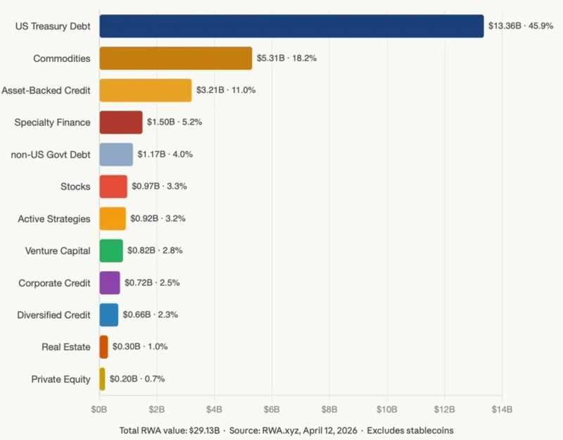 세부적으로는 미국 국채 기반 토큰이 전체 시장의 절반가량을 차지하며 가장 큰 비중을 기록했다. 이어 원자재(commodities) 부문이 50억달러 이상 규모로 뒤를 이었다.