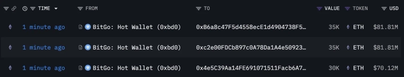 23일(현지시간) 룩온체인(Lookonchain)에 따르면 비트마인(Bitmine)과 연관된 것으로 추정되는 3개의 신규 지갑 주소가 최근 커스터디 업체 비트고(BitGo)로부터 약 10만 ETH(약 2억3370만달러)를 이체받았다.