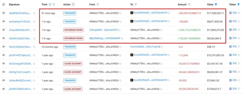 - 약 10개월간 휴면 상태였던 솔라나 고래 지갑이 30만439 SOL을 언스테이킹 후 바이낸스로 이체했다고 전했다.