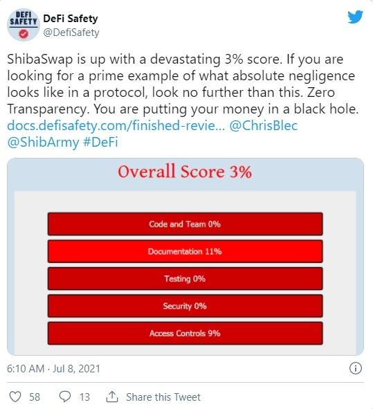 시바스왑에 대해 디파이 세이프티는 "완벽하게 부실한 프로토콜의 예시다. 투명성이 전혀 없으며 투자자들은 블랙홀에 자금을 집어 넣고 있는 셈"이라고 혹평했다.