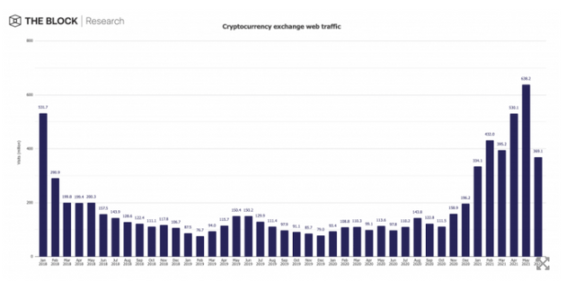 가상자산(암호화폐) 전문 미디어 더블록(The Block)이 웹사이트 방문 트래픽 추적기 시밀러웹 데이터를 인용해 6월 가상자산 거래소 웹 트래픽이 전월 대비 42.2% 감소했다고 8일(현지시간) 보도했다.