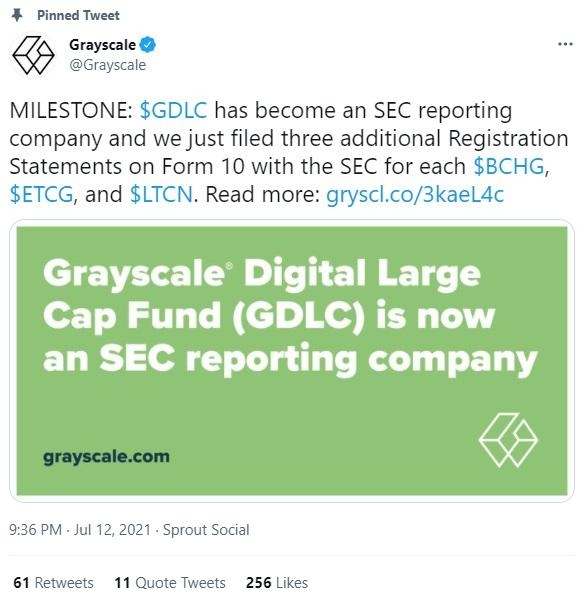 12일(현지시간) 그레이스케일인베스트먼트가 "비트코인캐시신탁(BCHG), 이더리움캐시신탁(ETCG), 라이트코인신탁(LTCG) 등의 펀드 출시를 목적으로 미국 증권거래위원회(SEC)에 폼-10(Form-10)을 제출했다"고 밝혔다. 폼-10은 정기 실적 보고서로 펀드 운용시 증권거래위원회의 규제를 적용받는다.