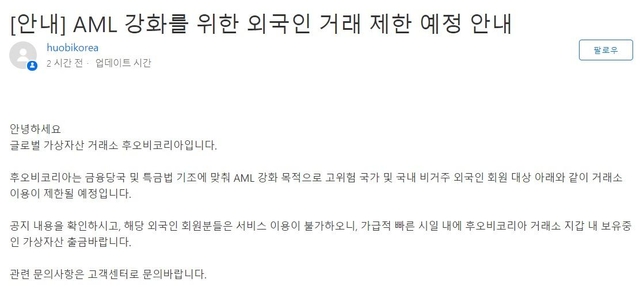 14일 후오비코리아가 금융당국 및 특금법 기조에 맞춰 자금세탁방지(AML) 강화 목적으로 고위험 국가 및 국내 비거주 외국인 회원을 대상으로 거래소 이용을 제한할 예정이라고 밝혔다.