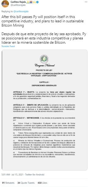 이어 "이번 법안이 통과되면 파라과이는 가상자산 산업에서 입지를 강화하고 비트코인(BTC) 채굴도 주도하게 될 것이다"고 덧붙였다.