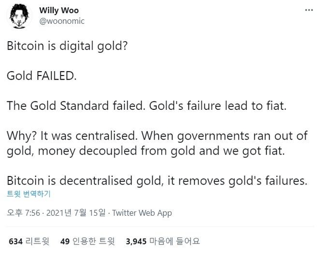 15일(현지시간) 가상자산(암호화폐) 온체인 분석가 윌리 우가 "비트코인(BTC)은 '탈중앙화된 금'이며 이를 두고 '디지털 금'이라고 불러선 안된다. 비트코인의 탈중앙화 특성은 금의 실패를 반복하지 않을 것"이라고 말했다.