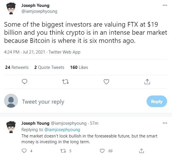 그는 "대형투자자는 글로벌 가상자산 거래소 FTX의 기업가치를 190억 달러로 평가했다. 스마트머니(전문적인 지식을 갖고 투자한 돈)는 장기적인 관점에서 시장을 바라본다"고 덧붙였다.