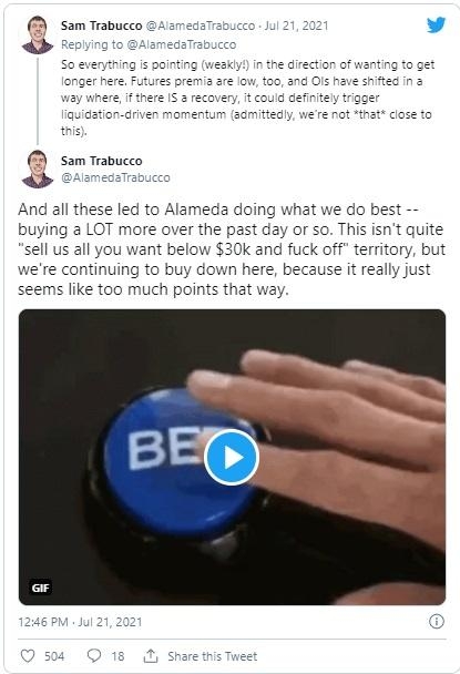 샌 트라부코 알라메다리서치 트레이더는 "우리는 이번 하락장에서 3만 달러 아래 가격에 비트코인을 매수했으며 가격이 회복될 것으로 판단하고 있다. 중국의 가상자산 채굴 금지, GBTC 락업 해제 등 악재가 모두 소모됐으며 증권 시장도 회복세를 보이고 있다"고 설명했다.