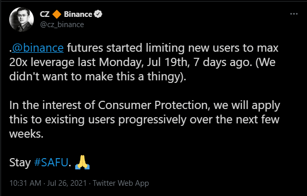 창펑 자오 최고경영자는 "바이낸스 퓨쳐스는 7월 19일부터 신규 사용자의 레버리지 최대 비율을 20배로 제한하기 시작했으며, 소비자 보호를 위해 앞으로 몇 주에 걸쳐 기존 사용자들에게도 이를 적용할 예정"이라고 설명했다.