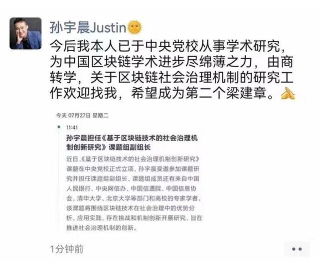 27일(현지시간) 가상자산(암호화폐) 전문 독립 언론인 콜린 우(Colin Wu)에 따르면 저스틴 선 트론(TRX) 창시자는 중국 소셜미디어를 통해 비즈니스에서 학문으로 전향할 것이라고 밝혔다.미디어에 따르면 저스틴 선은 "중국 공산당 중앙당교(中央党校)에 한 프로젝트의 부대표로서 합류할 계획"이라며 "해당 프로젝트의 취지는 블록체인을 활용해 사회 거버넌스를 지원하는 것"이라고 언급했다.