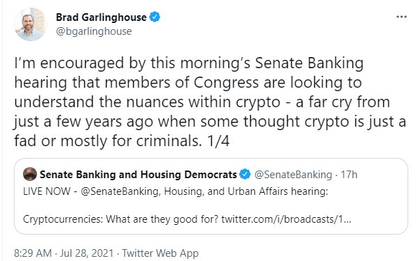 28일(현지시간) 가상자산(암호화폐) 전문 미디어 유투데이에 따르면 브래드 갈링하우스 리플 최고경영자(CEO)가 최근 미국 상원 은행위원회에서 암호화폐 관련 청문회를 개최한 것을 두고 "의원들이 암호화폐를 이해하고자 노력하고 있다는 소식에 기뻤다"고 말했다.
