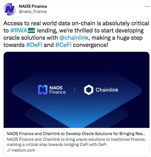 탈중앙화 금융(디파이) 대출 플랫폼인 나오스 파이낸스(NAOS)가 공식 트위터를 통해 “체인링크(LINK)와 함께 오라클 솔루션을 개발하기 시작했다”며 “디파이와 중앙화 금융상품(시파이)의 결합을 도울 것”이라고 지난 4일 밝혔다.