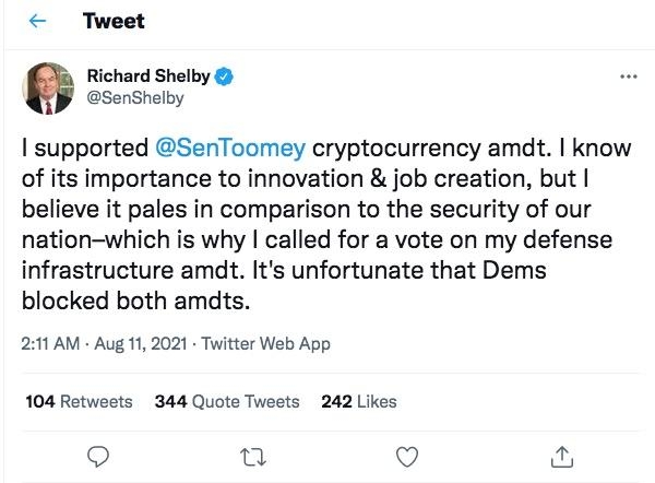 11일 셸비 상원의원은 자신의 트위터에서 "인프라법 개정안의 혁신과 일자리 창출 효과를 안다. 하지만 국방에 비할 바는 아니라고 생각했다"면서 자신이 주장한 군사비 증액안이 민주당의 반대로 이번 개정안에 반영되지 않자 반대 의사를 표명한 것이라고 강조했다.