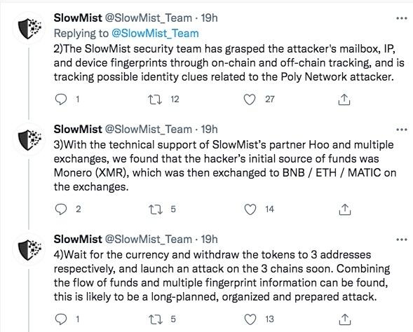 또 “슬로우미스트의 보안팀은 공격자의 메일박스, IP, 기기 사용 흔적을 추적했고 범행의 단서를 발견하고 있다”면서 “우리는 폴리네트워크의 보안 취약점을 상세히 분석하고 있다”고 덧붙였다.